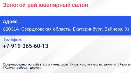 Золотой рай, ювелирный салон по адресу 620014, Свердловская область, Екатеринбург, Вайнера, 9а в дальнейшем Организация, размещена в следующих категориях: