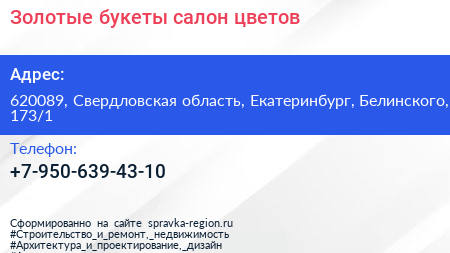 Золотые букеты, салон цветов по адресу 620089, Свердловская область, Екатеринбург, Белинского, 173/1 в дальнейшем Организация, размещена в следующих категориях: