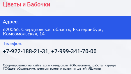 Цветы и Бабочки по адресу 620066, Свердловская область, Екатеринбург, Комсомольская, 14 в дальнейшем Организация, размещена в следующих категориях: