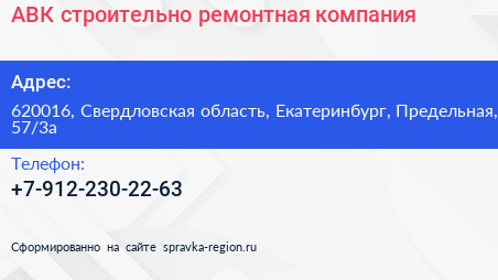 АВК, строительно-ремонтная компания по адресу 620016, Свердловская область, Екатеринбург, Предельная, 57/3а в дальнейшем Организация, размещена в следующих категориях: