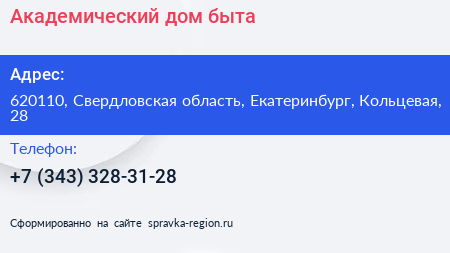 Академический, дом быта по адресу 620110, Свердловская область, Екатеринбург, Кольцевая, 28 в дальнейшем Организация, размещена в следующих категориях: