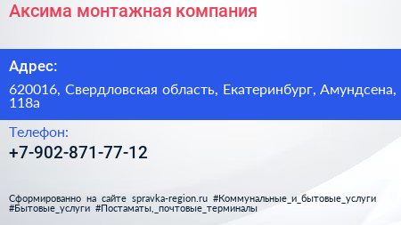 Аксима, монтажная компания по адресу 620016, Свердловская область, Екатеринбург, Амундсена, 118а в дальнейшем Организация, размещена в следующих категориях: