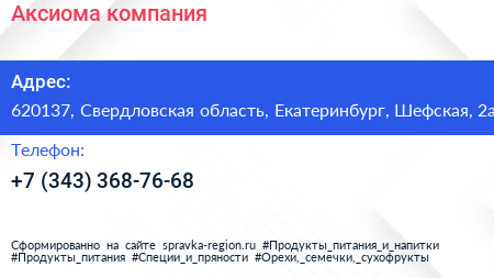 Аксиома, компания по адресу 620137, Свердловская область, Екатеринбург, Шефская, 2а в дальнейшем Организация, размещена в следующих категориях: