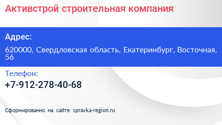 Активстрой, строительная компания по адресу 620000, Свердловская область, Екатеринбург, Восточная, 56 в дальнейшем Организация, размещена в следующих категориях: