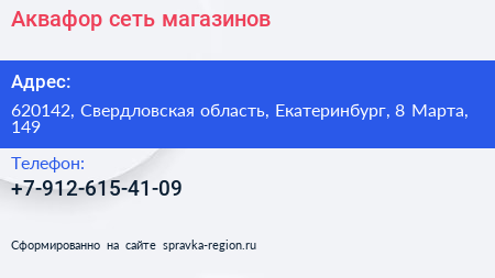 Аквафор, сеть магазинов по адресу 620142, Свердловская область, Екатеринбург, 8 Марта, 149 в дальнейшем Организация, размещена в следующих категориях: