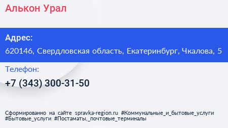 Алькон-Урал по адресу 620146, Свердловская область, Екатеринбург, Чкалова, 5 в дальнейшем Организация, размещена в следующих категориях: