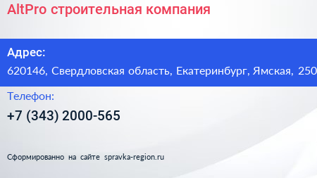 AltPro, строительная компания по адресу 620146, Свердловская область, Екатеринбург, Ямская, 250 в дальнейшем Организация, размещена в следующих категориях: