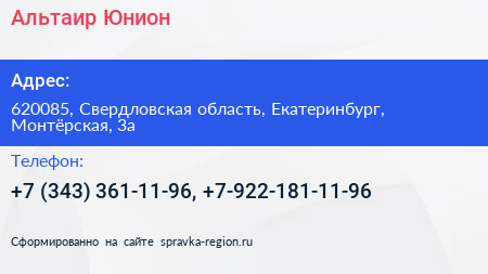 Альтаир Юнион по адресу 620085, Свердловская область, Екатеринбург, Монтёрская, 3а в дальнейшем Организация, размещена в следующих категориях: