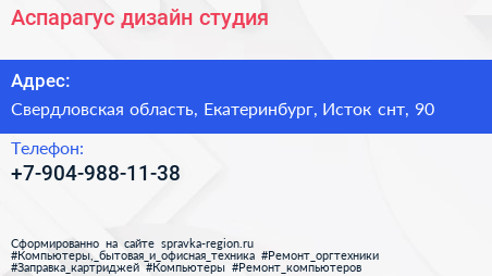 Аспарагус, дизайн-студия по адресу Свердловская область, Екатеринбург, Исток снт, 90 в дальнейшем Организация, размещена в следующих категориях: