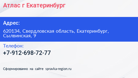Атлас, г. Екатеринбург по адресу 620134, Свердловская область, Екатеринбург, Сылвинская, 9 в дальнейшем Организация, размещена в следующих категориях: