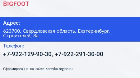 BIGFOOT по адресу 623700, Свердловская область, Екатеринбург, Строителей, 8а в дальнейшем Организация, размещена в следующих категориях: