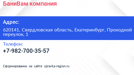 БаниВам, компания по адресу 620141, Свердловская область, Екатеринбург, Проходной переулок, 1 в дальнейшем Организация, размещена в следующих категориях: