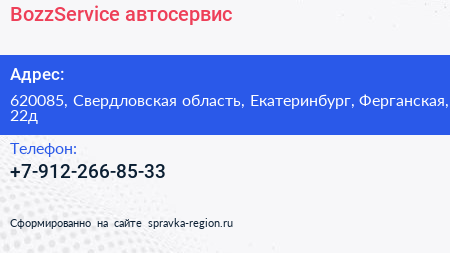 BozzService, автосервис по адресу 620085, Свердловская область, Екатеринбург, Ферганская, 22д в дальнейшем Организация, размещена в следующих категориях: