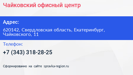 Чайковский, офисный центр по адресу 620142, Свердловская область, Екатеринбург, Чайковского, 11 в дальнейшем Организация, размещена в следующих категориях: