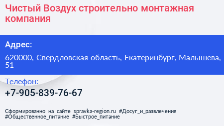Чистый Воздух, строительно-монтажная компания по адресу 620000, Свердловская область, Екатеринбург, Малышева, 51 в дальнейшем Организация, размещена в следующих категориях: