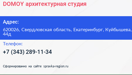 DOMOY, архитектурная студия по адресу 620026, Свердловская область, Екатеринбург, Куйбышева, 44д в дальнейшем Организация, размещена в следующих категориях: