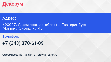 Декорум по адресу 620027, Свердловская область, Екатеринбург, Мамина-Сибиряка, 45 в дальнейшем Организация, размещена в следующих категориях: