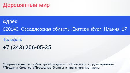 Деревянный мир по адресу 620143, Свердловская область, Екатеринбург, Ильича, 17 в дальнейшем Организация, размещена в следующих категориях: