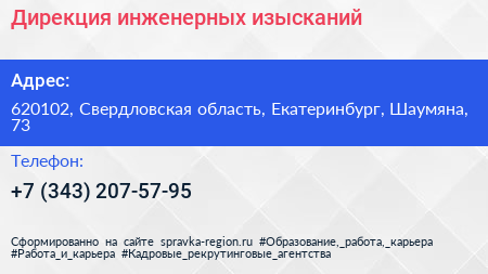 Дирекция инженерных изысканий по адресу 620102, Свердловская область, Екатеринбург, Шаумяна, 73 в дальнейшем Организация, размещена в следующих категориях: