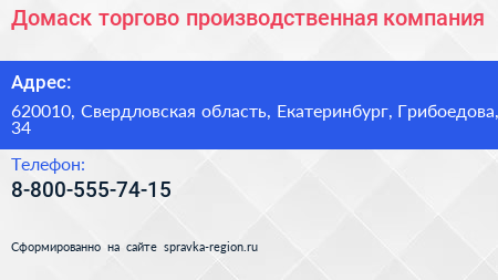 Домаск, торгово-производственная компания по адресу 620010, Свердловская область, Екатеринбург, Грибоедова, 34 в дальнейшем Организация, размещена в следующих категориях: