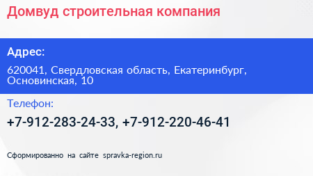 Домвуд, строительная компания по адресу 620041, Свердловская область, Екатеринбург, Основинская, 10 в дальнейшем Организация, размещена в следующих категориях: