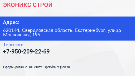 ЭКОНИКС-СТРОЙ по адресу 620144, Свердловская область, Екатеринбург, улица Московская, 195 в дальнейшем Организация, размещена в следующих категориях: