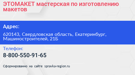 ЭТОМАКЕТ, мастерская по изготовлению макетов по адресу 620143, Свердловская область, Екатеринбург, Машиностроителей, 21Б в дальнейшем Организация, размещена в следующих категориях: