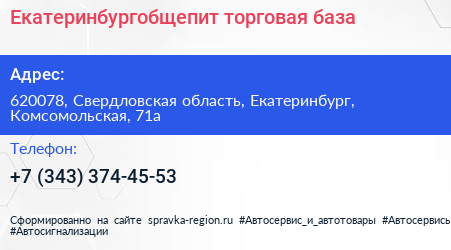 Для связи с организацией воспользуйтесь номером телефона: +7 (343) 374-45-53. Пн: c 08:00-17:00, Вт: c 08:00-17:00, Ср: c 08:00-17:00, Чт: c 08:00-17:00, Пт: c 08:00-17:00, Сб: c 08:00-14:00, Вс: выходной, вы можете обратиться в эту организацию.