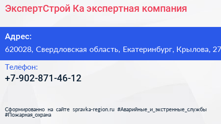 ЭкспертСтрой-Ка, экспертная компания по адресу 620028, Свердловская область, Екатеринбург, Крылова, 27 в дальнейшем Организация, размещена в следующих категориях: