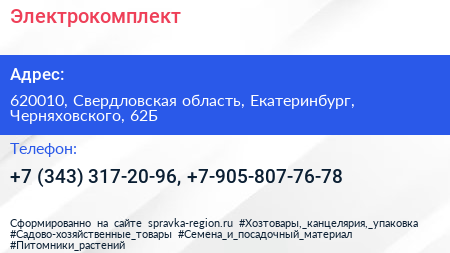 Электрокомплект по адресу 620010, Свердловская область, Екатеринбург, Черняховского, 62Б в дальнейшем Организация, размещена в следующих категориях: