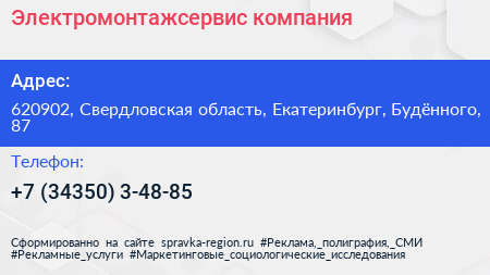 Электромонтажсервис, компания по адресу 620902, Свердловская область, Екатеринбург, Будённого, 87 в дальнейшем Организация, размещена в следующих категориях: