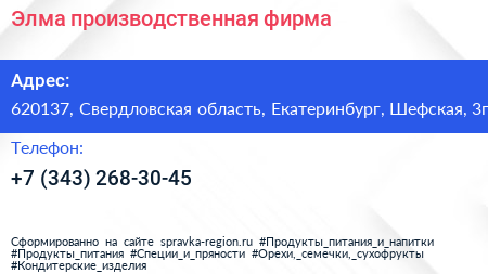 Элма, производственная фирма по адресу 620137, Свердловская область, Екатеринбург, Шефская, 3г в дальнейшем Организация, размещена в следующих категориях: