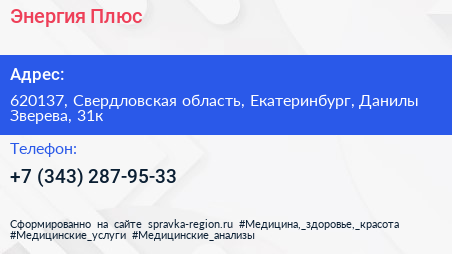 Энергия Плюс по адресу 620137, Свердловская область, Екатеринбург, Данилы Зверева, 31к в дальнейшем Организация, размещена в следующих категориях:
