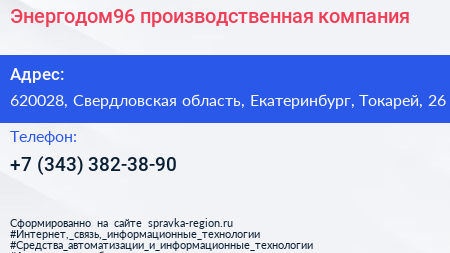 Энергодом96, производственная компания по адресу 620028, Свердловская область, Екатеринбург, Токарей, 26 в дальнейшем Организация, размещена в следующих категориях: