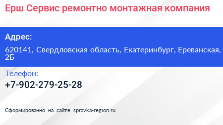 Ерш-Сервис, ремонтно-монтажная компания по адресу 620141, Свердловская область, Екатеринбург, Ереванская, 2Б в дальнейшем Организация, размещена в следующих категориях: