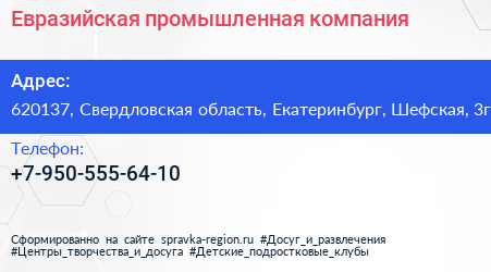 Евразийская промышленная компания по адресу 620137, Свердловская область, Екатеринбург, Шефская, 3г в дальнейшем Организация, размещена в следующих категориях: