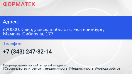 ФОРМАТЕК по адресу 620000, Свердловская область, Екатеринбург, Мамина-Сибиряка, 177 в дальнейшем Организация, размещена в следующих категориях: