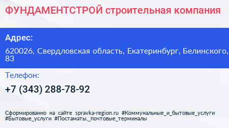 ФУНДАМЕНТСТРОЙ, строительная компания по адресу 620026, Свердловская область, Екатеринбург, Белинского, 83 в дальнейшем Организация, размещена в следующих категориях: