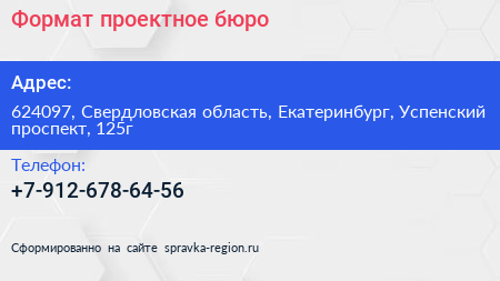 Формат, проектное бюро по адресу 624097, Свердловская область, Екатеринбург, Успенский проспект, 125г в дальнейшем Организация, размещена в следующих категориях:
