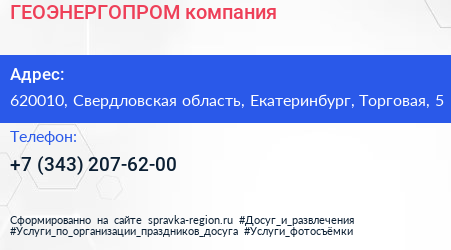 ГЕОЭНЕРГОПРОМ, компания по адресу 620010, Свердловская область, Екатеринбург, Торговая, 5 в дальнейшем Организация, размещена в следующих категориях:
