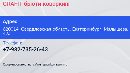 GRAFIT, бьюти-коворкинг по адресу 620014, Свердловская область, Екатеринбург, Малышева, 42а в дальнейшем Организация, размещена в следующих категориях:
