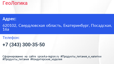 ГеоЛогика по адресу 620102, Свердловская область, Екатеринбург, Посадская, 16а в дальнейшем Организация, размещена в следующих категориях: