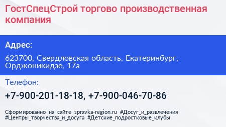 ГостСпецСтрой, торгово-производственная компания по адресу 623700, Свердловская область, Екатеринбург, Орджоникидзе, 17а в дальнейшем Организация, размещена в следующих категориях: