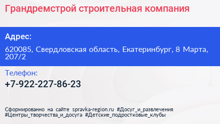 Грандремстрой, строительная компания по адресу 620085, Свердловская область, Екатеринбург, 8 Марта, 207/2 в дальнейшем Организация, размещена в следующих категориях: