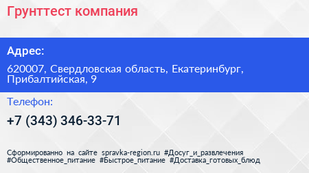 Грунттест, компания по адресу 620007, Свердловская область, Екатеринбург, Прибалтийская, 9 в дальнейшем Организация, размещена в следующих категориях: