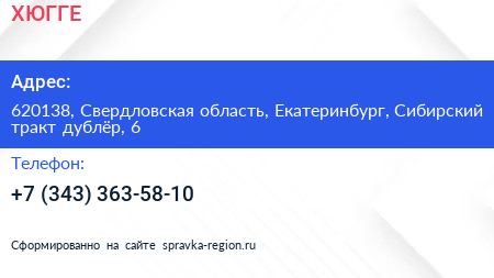 ХЮГГЕ по адресу 620138, Свердловская область, Екатеринбург, Сибирский тракт дублёр, 6 в дальнейшем Организация, размещена в следующих категориях: