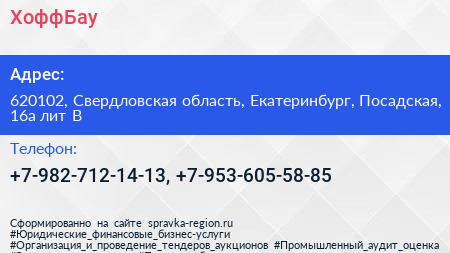 ХоффБау по адресу 620102, Свердловская область, Екатеринбург, Посадская, 16а лит В в дальнейшем Организация, размещена в следующих категориях: