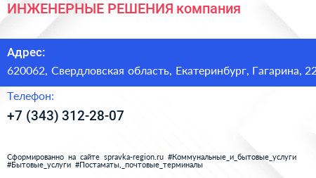 ИНЖЕНЕРНЫЕ РЕШЕНИЯ, компания по адресу 620062, Свердловская область, Екатеринбург, Гагарина, 22 в дальнейшем Организация, размещена в следующих категориях:
