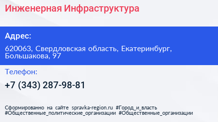 Инженерная Инфраструктура по адресу 620063, Свердловская область, Екатеринбург, Большакова, 97 в дальнейшем Организация, размещена в следующих категориях: