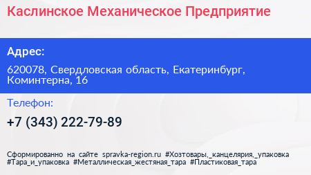 Каслинское Механическое Предприятие по адресу 620078, Свердловская область, Екатеринбург, Коминтерна, 16 в дальнейшем Организация, размещена в следующих категориях: